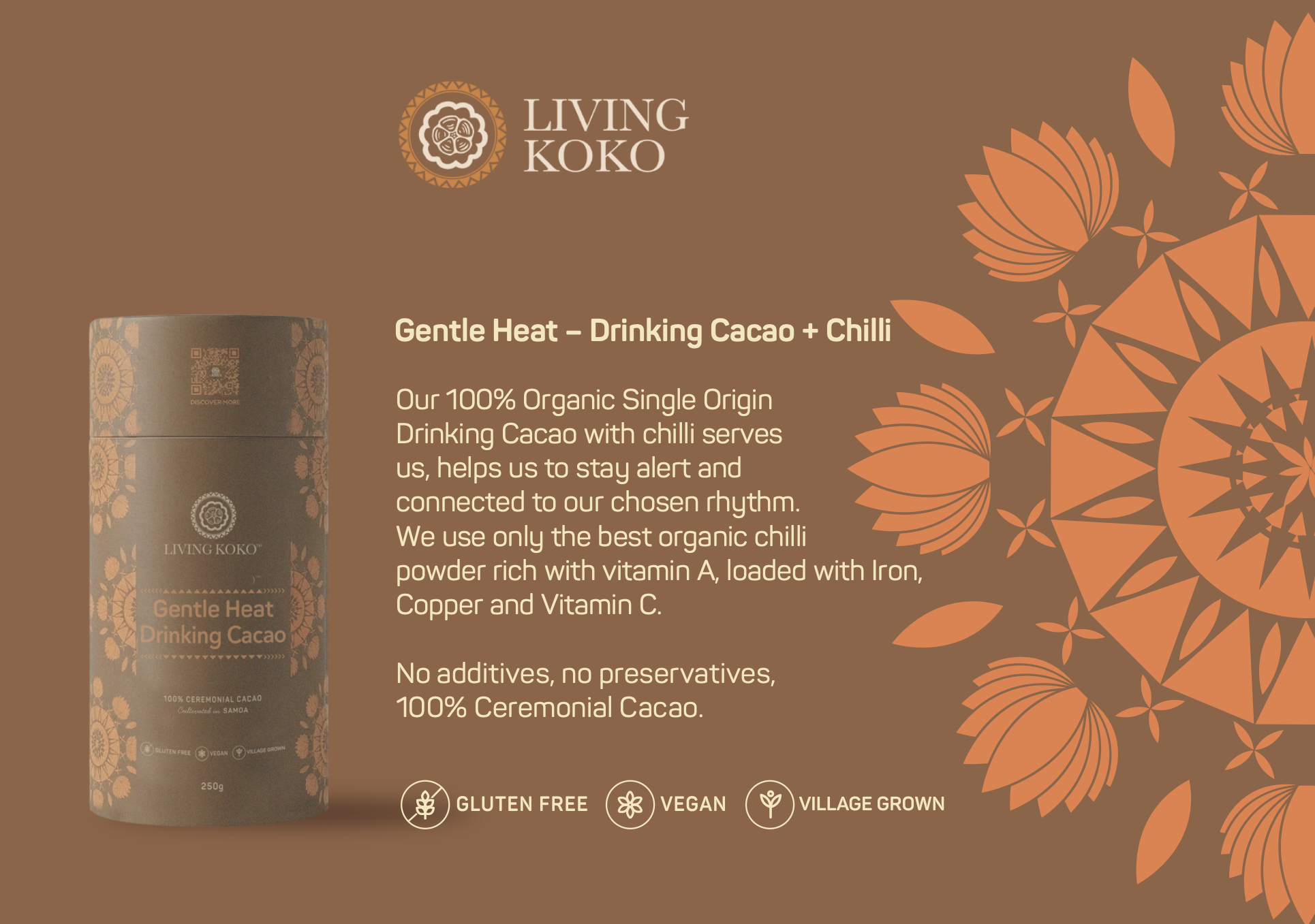 Our 100% Organic Single Origin Drinking Cacao with chilli serves us, helps us to stay alert and connected to our chosen rhythm. We use only the best organic chilli powder to bring you Gentle heat.