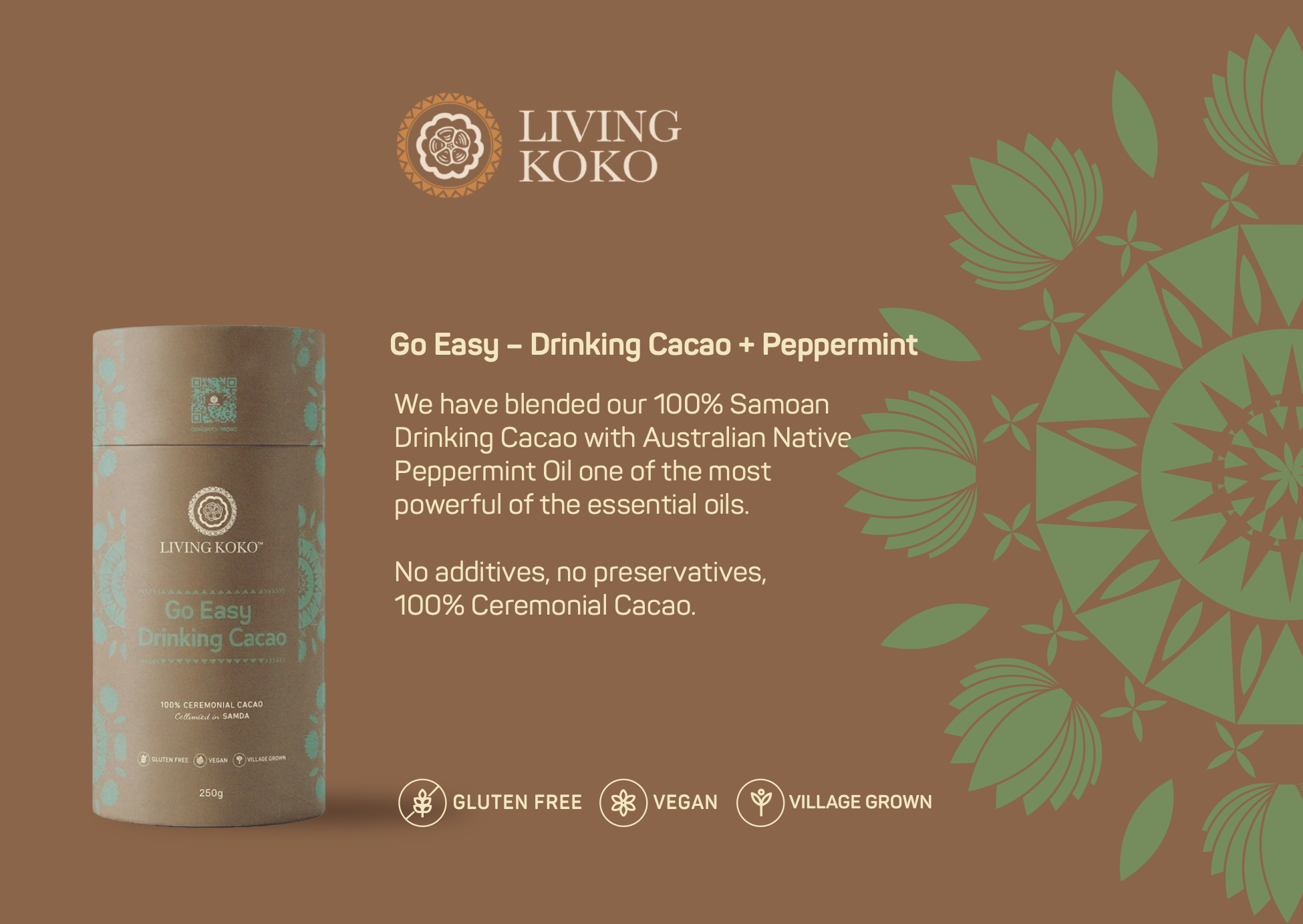 We have blended our 100% Samoan Drinking Cacao with Australian Native Peppermint oil, one of the most powerful of the essential oils. We decided to create Go Easy as a reminder to us and everyone out there that is OK to take some time out for self.